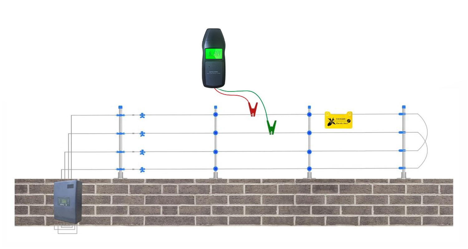 1.脈沖主機電壓測量:脈沖主機布防工作後 ,把脈沖電壓測量儀的夾具分布夾在脈沖圍欄上任意相鄰的兩根線上,如下圖所示: