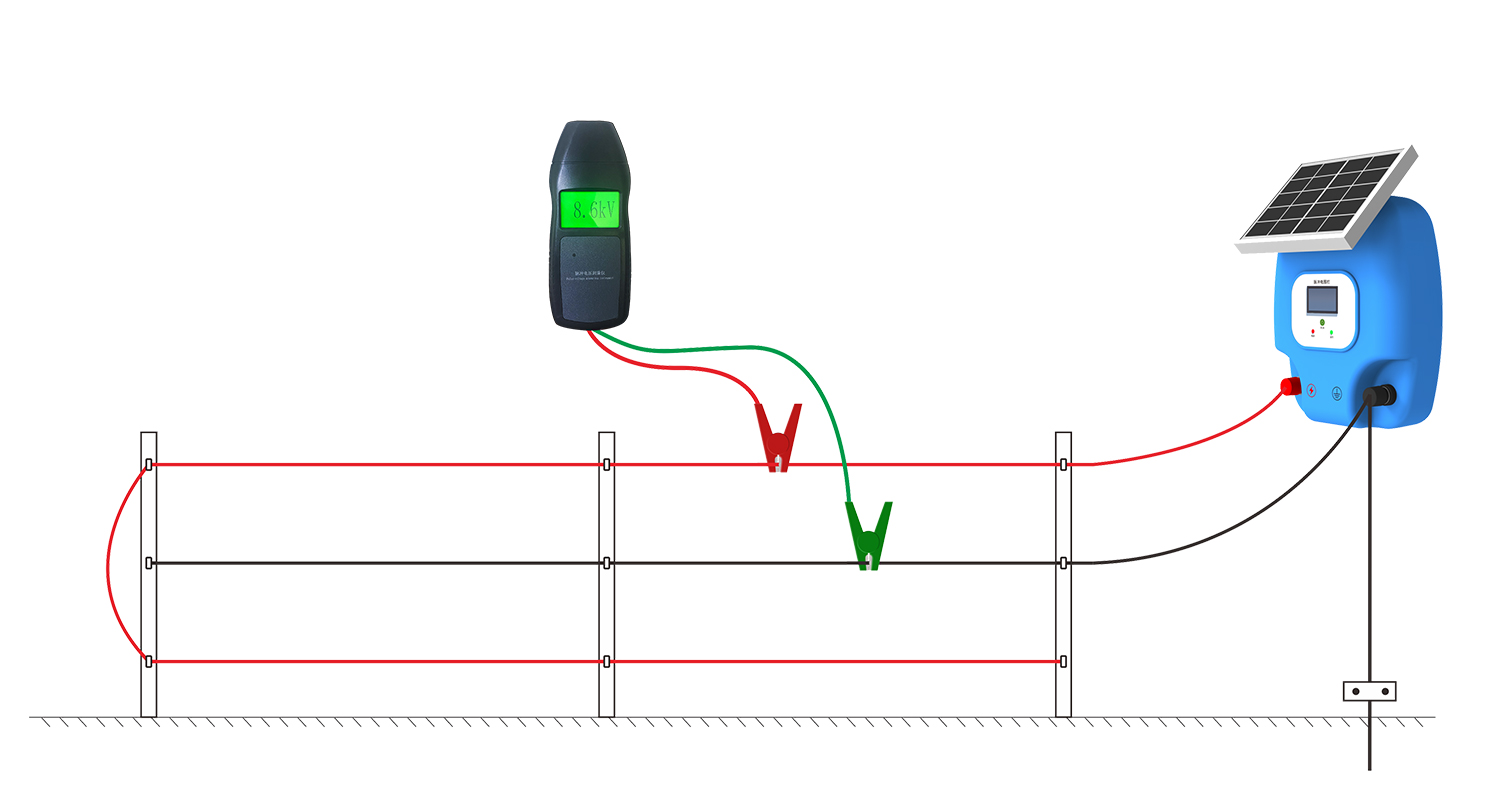 2.畜牧電圍欄電壓測量:畜牧電圍欄主機通電工作後,把脈沖電影測量儀的紅色夾具夾在電圍欄脈沖輸出線上,綠色夾具夾在電圍欄接地線上,如下圖所示: